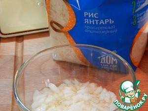 Рис отвариваем до готовности и остужаем. Лук мелко режем и выдерживаем минут 10 в яблочном уксусе, можно в лимонном соке.