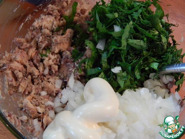 В миске разминаем рыбу, добавляем мелко нарезанную зелень, лук и 1 ст. л. майонеза.
