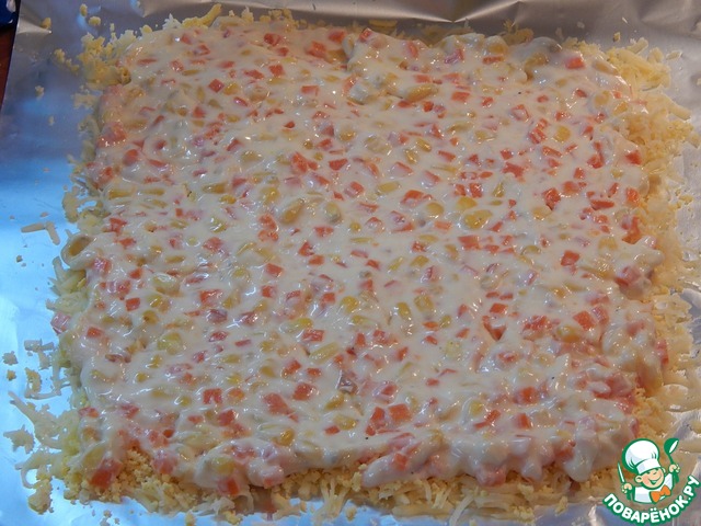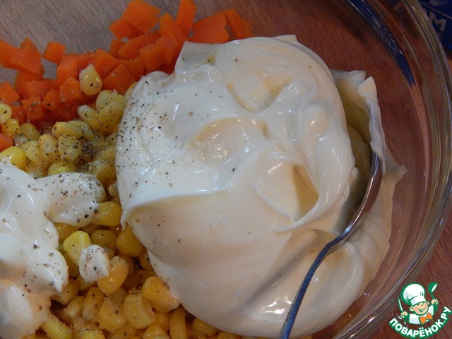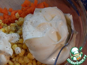В другой миске смешиваем морковь, сыр сливочной (берите сыр хорошего качества), кукурузу и 1 ст. л. майонеза. Перчим по вкусу.