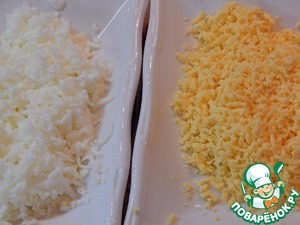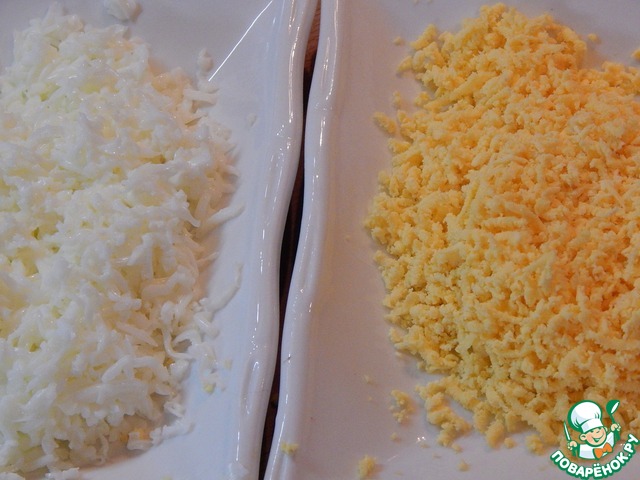 Начинаем формировать салат. На фольгу или пленку натираем слой твердого сыра и распределяем желток.