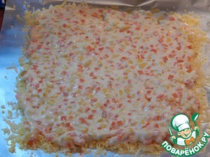 Далее аккуратно выкладываем сырно-овощную массу. Стараемся слои приминать.