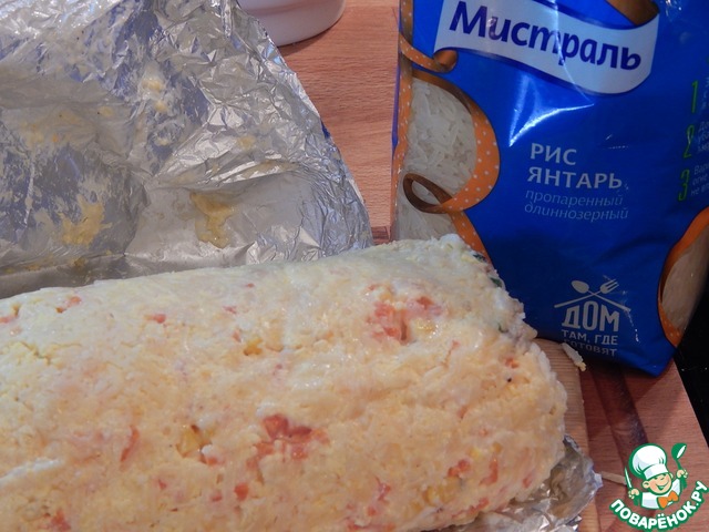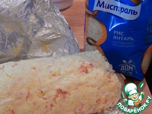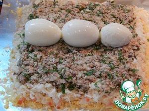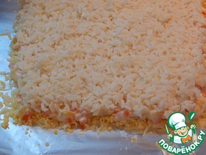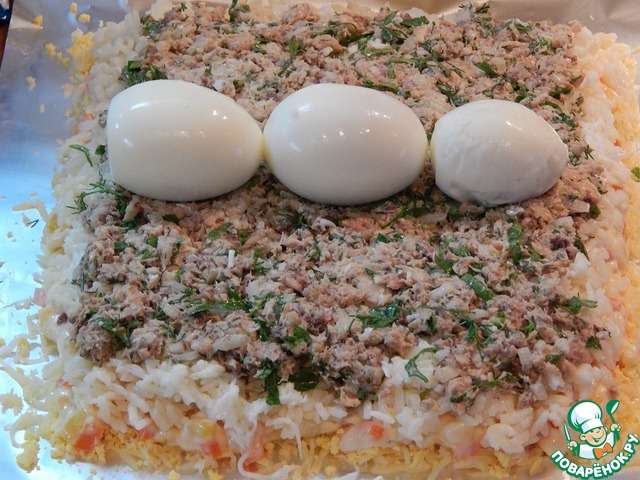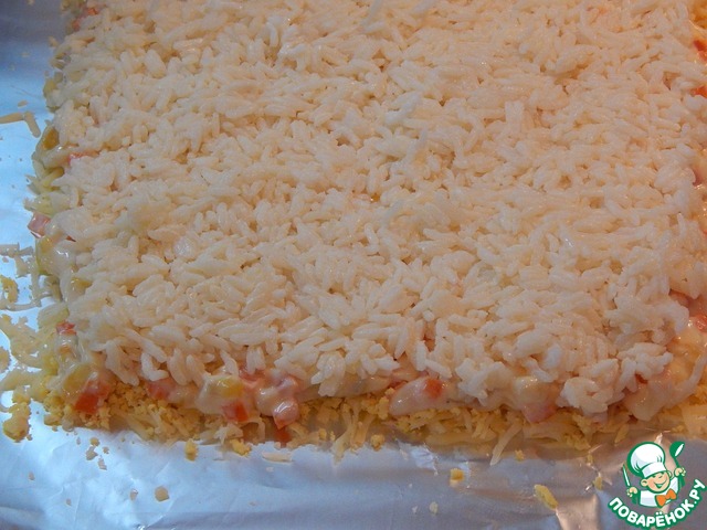 Затем идет слой риса, перемешанного с 2 ст. л. майонеза. На рис выкладываем белок.