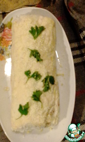 Перед подачей достаем рулет из холодильника, разворачиваем фольгу, выкладываем на блюдо. Можно сверху оформить зеленью и сыром.