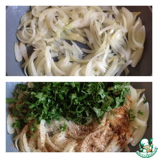 Лук нарезать полукольцами и поставить обжаривать в небольшом количестве растительного масла. Как только лук станет мягким, добавить к нему мелко нарезанную зелень и все специи. Продолжать тушить на небольшом огне пару минут -