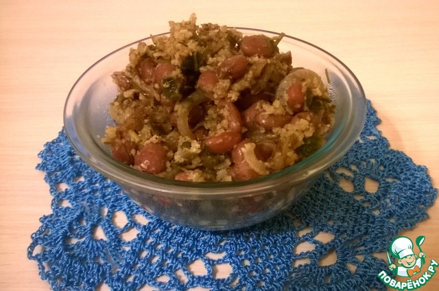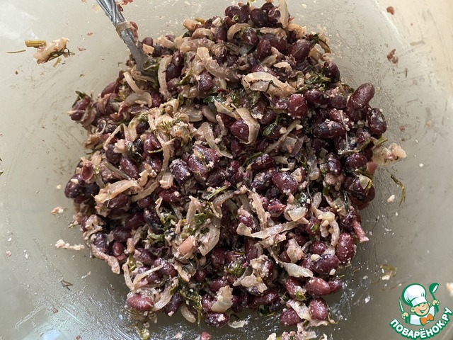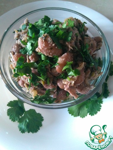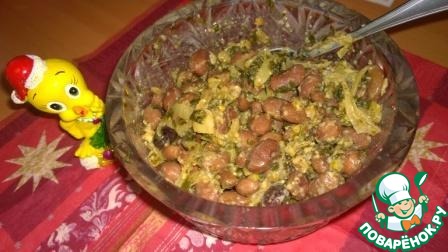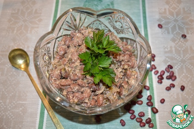 В салатник выложить фасоль, чеснок, пропущенный через пресс, остывшую обжарку, добавить немного растительного масла и соли. Салат перемешать -