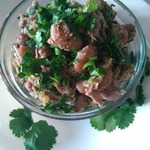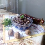 Добавить к салату грецкие орехи, перетертые в "пыль". Я воспользовалась блендером. Салат перемешать и дать ему постоять хотя бы 30 минут, если хватит сил удержаться от дегустации, которая у меня обычно переходит в поедание салата.))