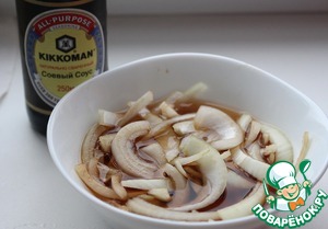 Лук почистить и нарезать тонкими полукольцами. Смешать соевый соус с медом, бальзамическим уксусом и небольшим количеством воды. Залить лук и оставить мариноваться на 30 минут. Затем лук тщательно отжать.