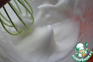 Отделить белки от желтков. Белки взбить с щепоткой соли до "твердых" пиков.