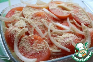 Половину кукурузной каши выложить в форму, смазанную растительным маслом и присыпанную панировочными сухарями. Посыпать по всей поверхности сыром. Выложить другую половину каши, сверху - помидоры и лук. Присыпать орегано и панировочными сухарями. Выпекатиь в предварительно разогретой до 180 градусов духовке 40 минут.