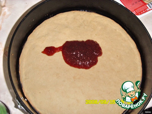 Когда тесто пропечётся, на тёплый корж намазать джём (у меня клубничный).