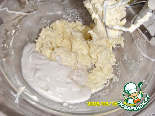 Отделяем белки от желтков. В желтки кладем сах. песок, взбиваем.