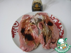 • Отбивные сбрызнуть соевым соусом, оставить на 10 минут. У меня соус Kikkoman.