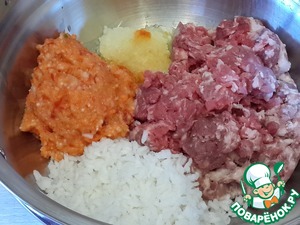 В мясной фарш добавьте рис, измельчите блендером чуть спассерованную морковь и сырой лук, добавьте по желанию чили перец.