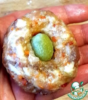 Сформируйте из фарша котлетки, каждую котлетку начините оливкой