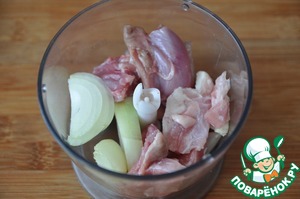 Берём куриное филе, желательно с бёдер, оно пожирнее, добавляем лук и всё измельчаем блендером. Нет необходимости измельчать в пасту, лучше, чтобы оставались кусочки.
