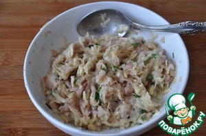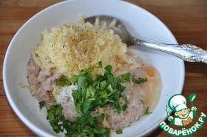 К куриному филе добавляем натертый на средней терке картофель, яйцо, измельчённую петрушку, соль и свежемолотую смесь перцев.