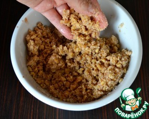 Натереть на крупной тёрке охлаждённое сливочное масло. Добавить корицу и перетереть всё руками до крупной влажной крошки.