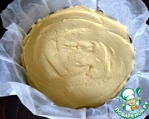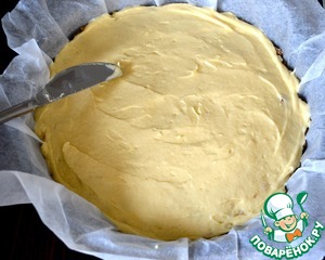 Форму для выпечки (24 см диаметром) выложить пекарской бумагой (по желанию можно смазать немного маслом, я этого не делала.) Выложить в форму половину теста и разровнять.