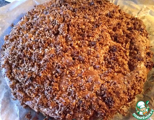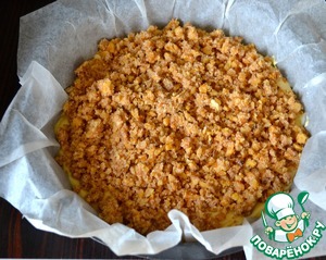 Закрыть всё оставшимся тестом. Оно получается достаточно мягким, и при попытке разровнять его по ореховой крошке тянется за силиконовой лопаткой. Поэтому в данном случае разровнять слой теста получилось удобнее всего ножом!