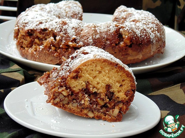 Несколько месяцев откладывала и вот... В начинке уменьшила количество масла, грецкие орехи смешала с фисташками и добавила щедрую щепотку соли. Орехи все выложила в серединку, и пекла в кольце. Получился наивкуснейший кекс. Очень ароматный и красивый. В следующий раз попробую половинку начинки выложить на дно кольца, чтобы сахар превратился в карамель, а орешки оказались сверху.