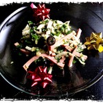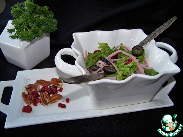Заправить салат, добавить измельченную клюкву, мелко нарезаную петрушку.