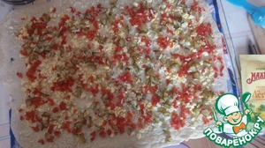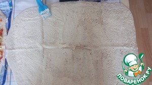 Второй лист лаваша, так же смазываем майонезом. После этого, накрываем им (стороной, которую смазали майонезом), наш первый лист, на котором находятся все ингредиенты.