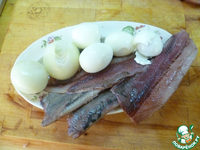• Доводим до ума ингредиенты пока свиная шкурка отваривается. Сельдь освобождаем от косточек, варим чистим яйца, готовим лук