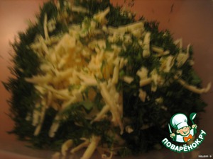 Соединить сметану с сыром и зеленью, влить немного воды или бульона, размешать