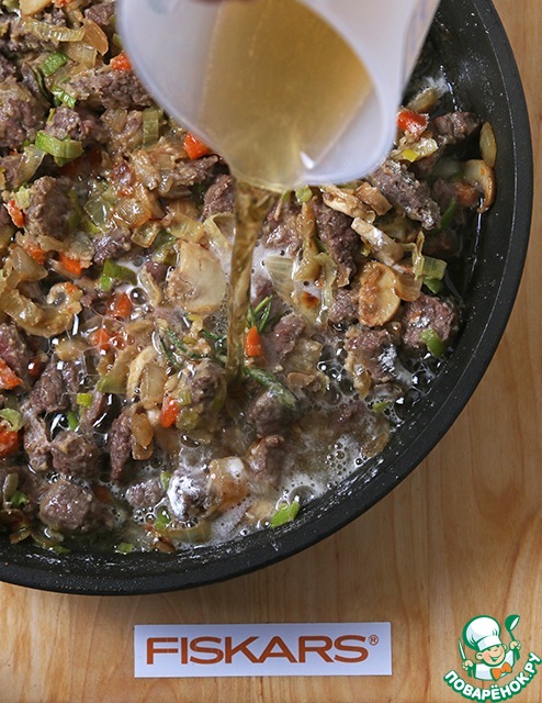 • 4. Вливаем пиво, еще раз хорошо перемешиваем, добавляем немного воды, так, чтобы были покрыты овощи с мясом. Теперь ставим сковороду на плиту и доводим до кипения, после чего отправляем запекаться. Удобнее всего, если Вы изначально будете использовать сковороду со съемной ручкой или жаропрочную форму, в которой можно и жарить и запекать. Закрываем сковороду/форму крышкой или фольгой - и в духовку на час - полтора. Перемешиваем и еще на 30-60 минут. Когда достанете мясо из духовки, увеличьте температуру до 200-210 градусов. Время приготовления мяса зависит от размера кусочков, при нарезке примерно 3см это занимает 1,5 часа + 30 минут. Если у Вас замороженное тесто, самое время достать его размораживаться.