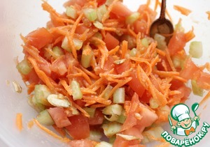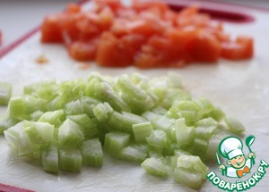 Помидор и сельдерей нарезать небольшими кубиками.