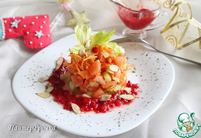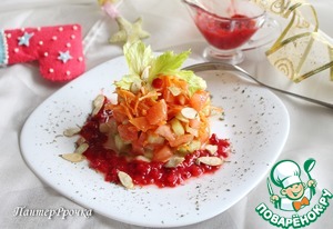 Это легкий и свежий овощной салат под клюквенным соусом. Я, конечно, не спорю, что на улице зима и хочется чего-нибудь сытного и жирного, но мне кажется, на праздничном столе этот салат будет как нельзя кстати. Яркий и красивый, с пикантным вкусом, он замечательно подойдет к мясу или птице.