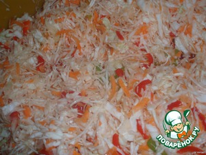 Мелко нашинковать капусту, натереть морковь, нарезать перец, свеклу - кружочками,