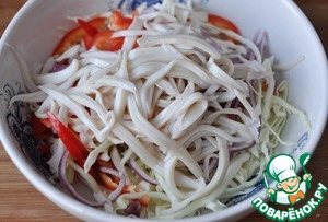 Остывший кальмар также режем тонкими полосками, и добавляем к овощам.