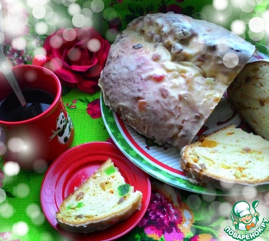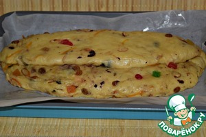Вымытый и обсушенный изюм смешать с орехами, цедрой апельсина и лимона и цукатами. Залить коньяком, перемешать и отставить, пока готовится тесто.