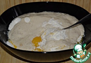 В оставшуюся просеянную муку добавить растопленное, но не горячее сливочное масло, яичные желтки, соль, подошедшую опару и ванилин.