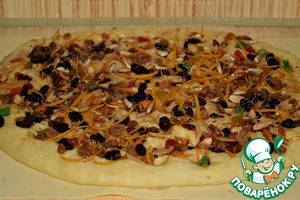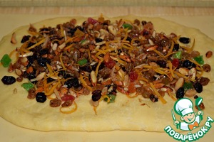 Подошедшее тесто выложить на рабочую поверхность, присыпанную мукой или смазанную растительным маслом, обмять и раскатать. Сверху выложить смесь изюма, орехов и цедры.