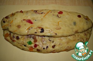 По истечении времени, раскатать тесто в овал толщиной 2-2,5 см. Разделить пласт ребром ладони вдоль так, чтобы одна половина овала получилась больше другой. Сложить пласт по намеченной линии, накладывая меньшую часть на большую.