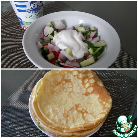 Можно к блинчикам подать разную начинку (например, с грибами, курицей, с луком и яйцом, с сыром и множество сладких начинок - с творогом, медом, сгущенкой, вареньем и т. д.)