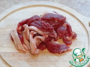 Утиную грудку порезать тонкими пластинами;