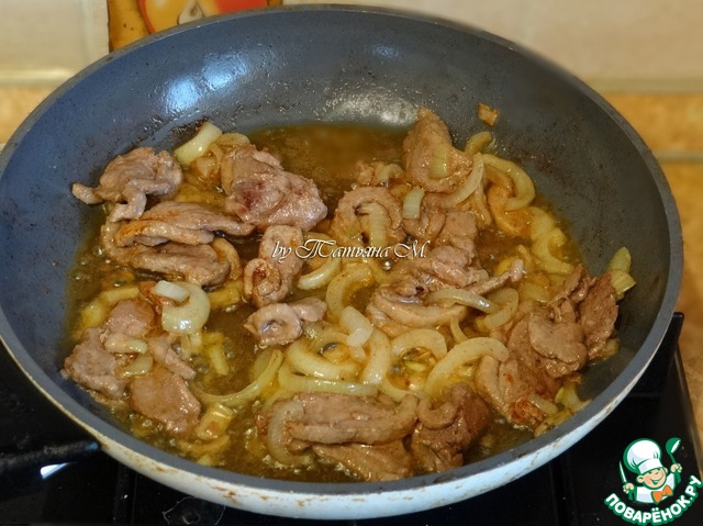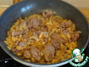 Грудку обжарить с резанным полукольцами луком на масле, добавить паприку;