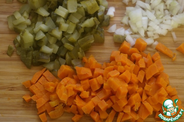 Морковь и огурцы нарезать небольшими кубиками, лук измельчить.
