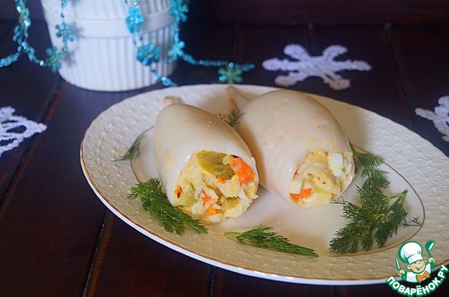 Оставшиеся 2 тушки кальмара наполнить салатом.