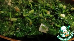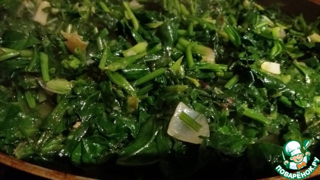 А затем нарезанный шпинат. Солим и перчим. Воду уже не добавляем.