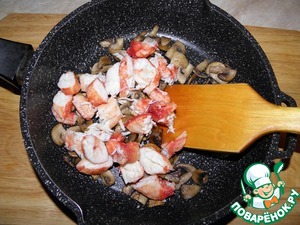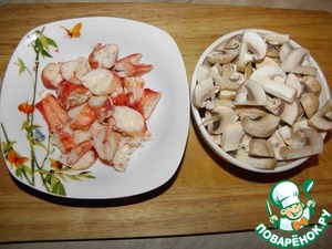 Крабы ( или крабовые палочки) нарезать, грибы нарезать пластинами.