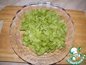 Салат нарезать полосками (можно нарвать) сбрызнуть оливковым маслом, чуть лимоном, посолить, поперчить, и выложить в тарелку.