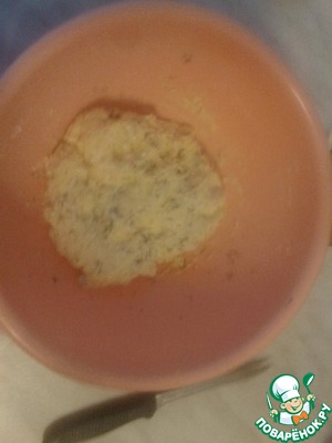 Добавляем укроп, соль и измельченные зубчики чеснока. замешиваем тесто. сначала растираем все вилкой\ложкой, потом руками. Процесс должен занять около 7 минут, тесто должно быть однородным