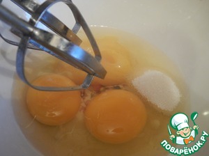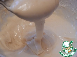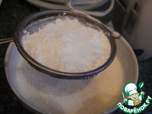 Добавить просеянную муку и разрыхлитель, хорошо перемешать тесто.