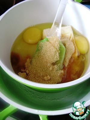 Смешать мед, масло, яйца и сахар в кастрюльке с антипригарным дном. Поставить на водяную баню и помешивать до растапливания продуктов и образования гладкой смеси, минут 10.
