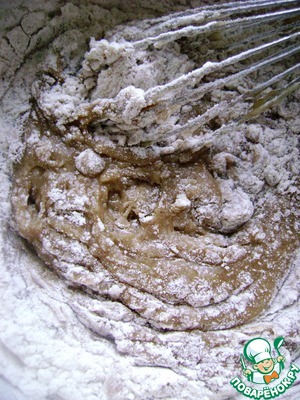 Постепенно всыпать муку в медовую смесь, аккуратно вымешивая тесто силиконовой лопаткой.
