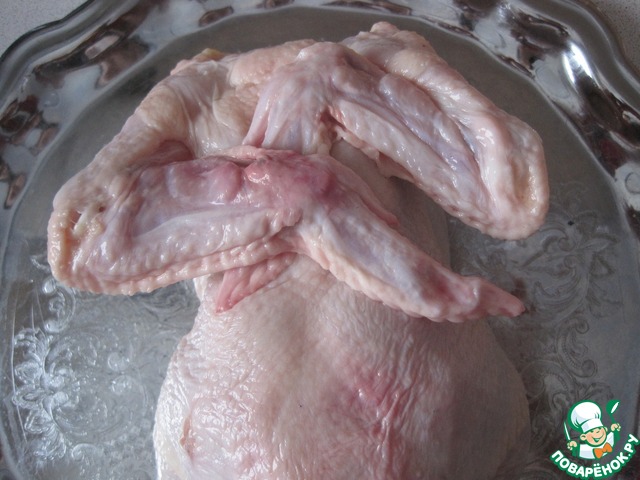 • Курицу промыть, заправить крылышки за спинку